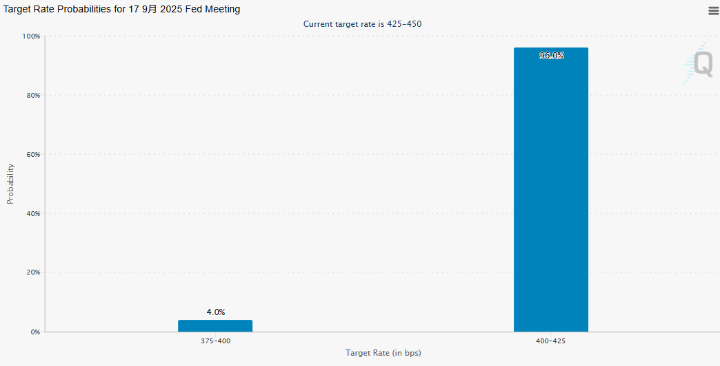 根据芝商所的美联储观察工具(FedWatch)显示,交易员目前对降息25个基点的概率定价为96%,而降息50个基点的概率仅为4%。尽管降息已板上钉钉,但市场反应仍将取决于美联储释放的具体政策信号。